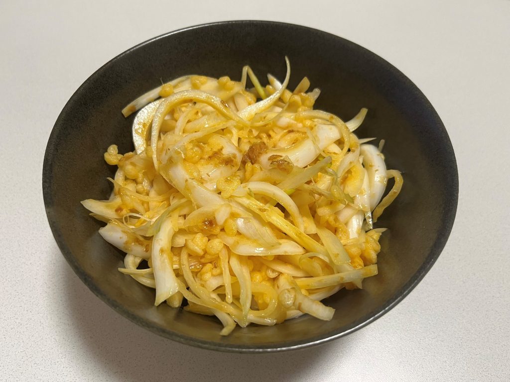 スライスした空飛ぶ新玉ネギに、天かす・生卵・鰹節を混ぜて、
