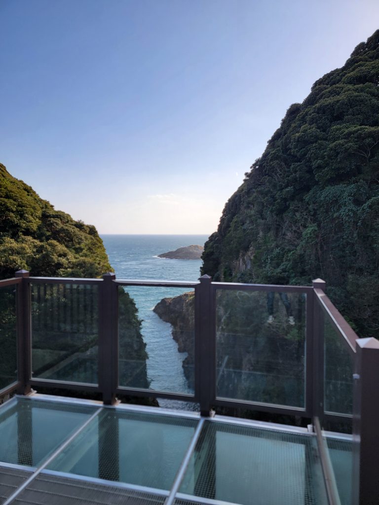 手すりの部分も透けているので、眼下の断崖絶壁をガラス越しに見ることができるスリル満点のスポットです。