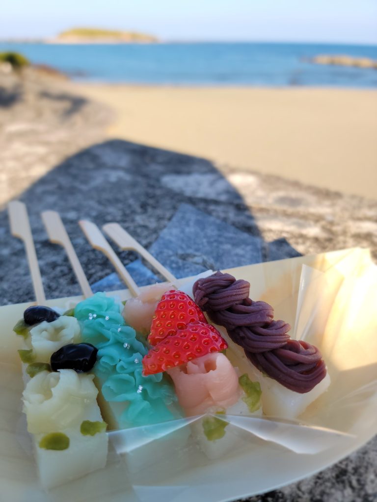 (今ですね、色んな新しい施設ができていて、さらに楽しいスポットになっているので、ぜひ青島に遊びに来ていただいてですね、美味しいプリンもありますし、ういろうという和菓子がありますけど、それを串にさして、可愛くあんこのせてアレンジした「青島ういろう串」っていうのも食べ歩きも出来ますんで、楽しんでいただければなと思います。)