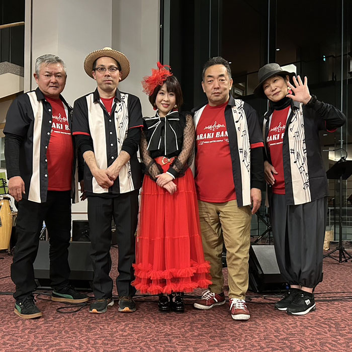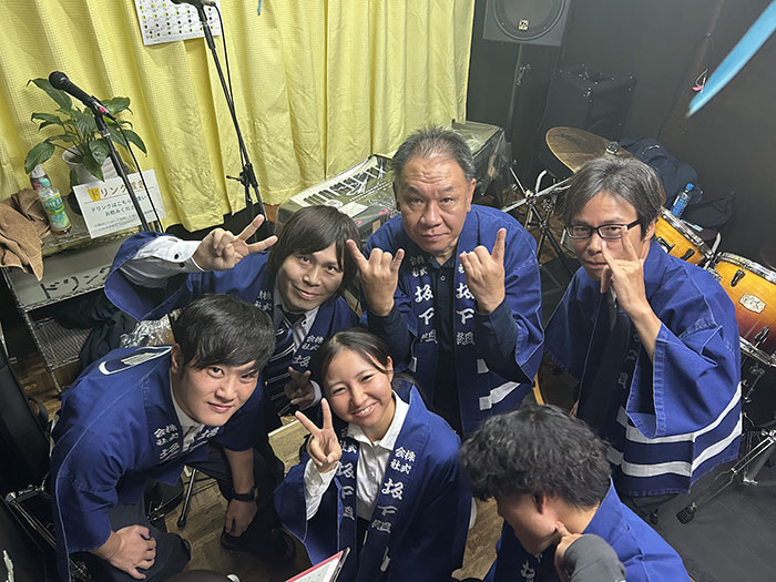 未来の建設業に明るい兆し。元気あふれる若手社員と、やさしいおじ様たちによる心温まるコラボレーションがここに誕生しました。メンバー紹介:- Gt. 坂田氏(総務部・経理担当)- Ba. 桒原氏(総務部・課長)- Dr. 那須氏(土木部・積算担当)- Vo. 古川氏(総務部)- Vo. 高木氏(建築部・新入社員)- Vo. 地神氏(土木部・新入社員)。 楽器隊は、やさしいおじ様たちで構成されています。普段は工事現場を支える縁の下の力持ちですが、ステージに立てば「今日は俺が主役だ!」と言わんばかりの熱いパフォーマンスを披露。若手ボーカル陣との絶妙な掛け合いが、現場とはひと味違う魅力を放ちます。